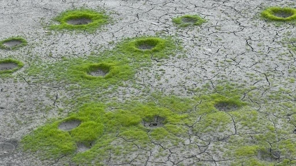 ㄟ,這些地面,裂開了,上面有一個、一個小坑洞,有的裝了水,有的還長出綠草來,這裡是哪裡?發揮一點想像力,這一片灰灰、龜裂的土地,像不像月球表面?更跑出好多個坑洞,網友笑稱,這難道是隕石坑嗎?