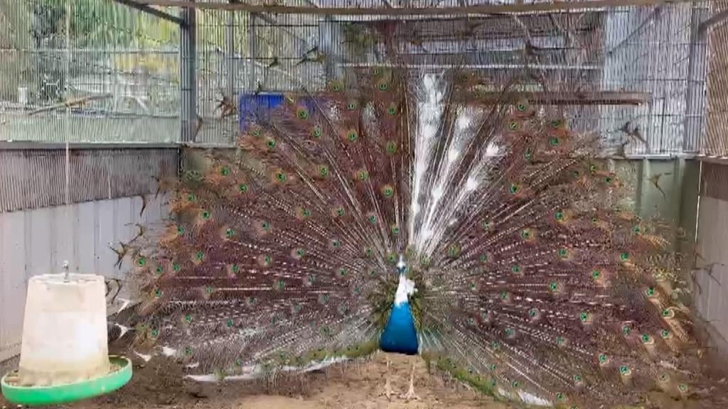 在苗栗縣頭份市,有飼養達人自然繁殖出罕見的特殊種孔雀,開屏時羽翼布滿藍白相間的裂紋,遠看就像一件會動的青花瓷藝品,相當具有觀賞性。現在,透過我們的鏡頭,一睹青花瓷孔雀的美貌。
