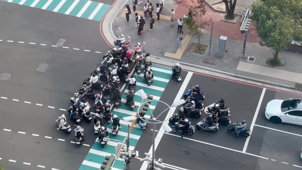 交通尖峰時段,機車族按照規定兩段式左轉,來到待轉格停下,不到半分鐘,就已經停滿滿,比較晚騎過來的騎士,只好自己找位置,邊騎還得邊小心旁邊過馬路的行人,有的機車被迫停在斑馬線上,有的停在車道上,險象環生。