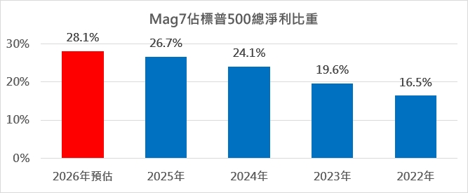 AI浪潮下的高獲利成長動能,更讓MAG7對於美股獲利貢獻度逐年攀升。根據Factset數值推算,2022年時MAG7的獲利合計僅占標普500總獲利的16.5%,隨AI趨勢發展和擴張,預估至2026年MAG7獲利佔比大盤,比重將進一步拉升至28.1%。