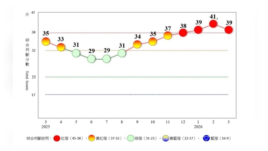 國內3月景氣燈號維持「紅燈」,代表整體經濟仍處於熱絡階段,不過熱度略有降溫。最新公布的景氣對策信號分數為39分,比2月修正後的41分小幅下降2分,顯示景氣雖然維持成長,但動能出現些微放緩。