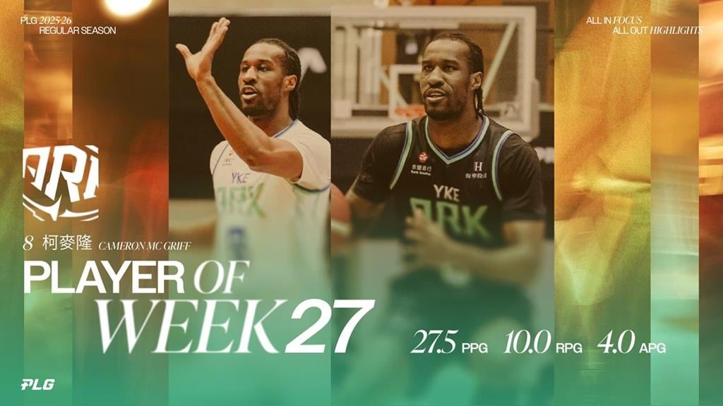 PLG2025-26球季第27週單週最佳球員今天公布,由洋基工程的柯麥隆榮獲此殊榮,他也拿下本季個人首次單週最佳球員獎項。