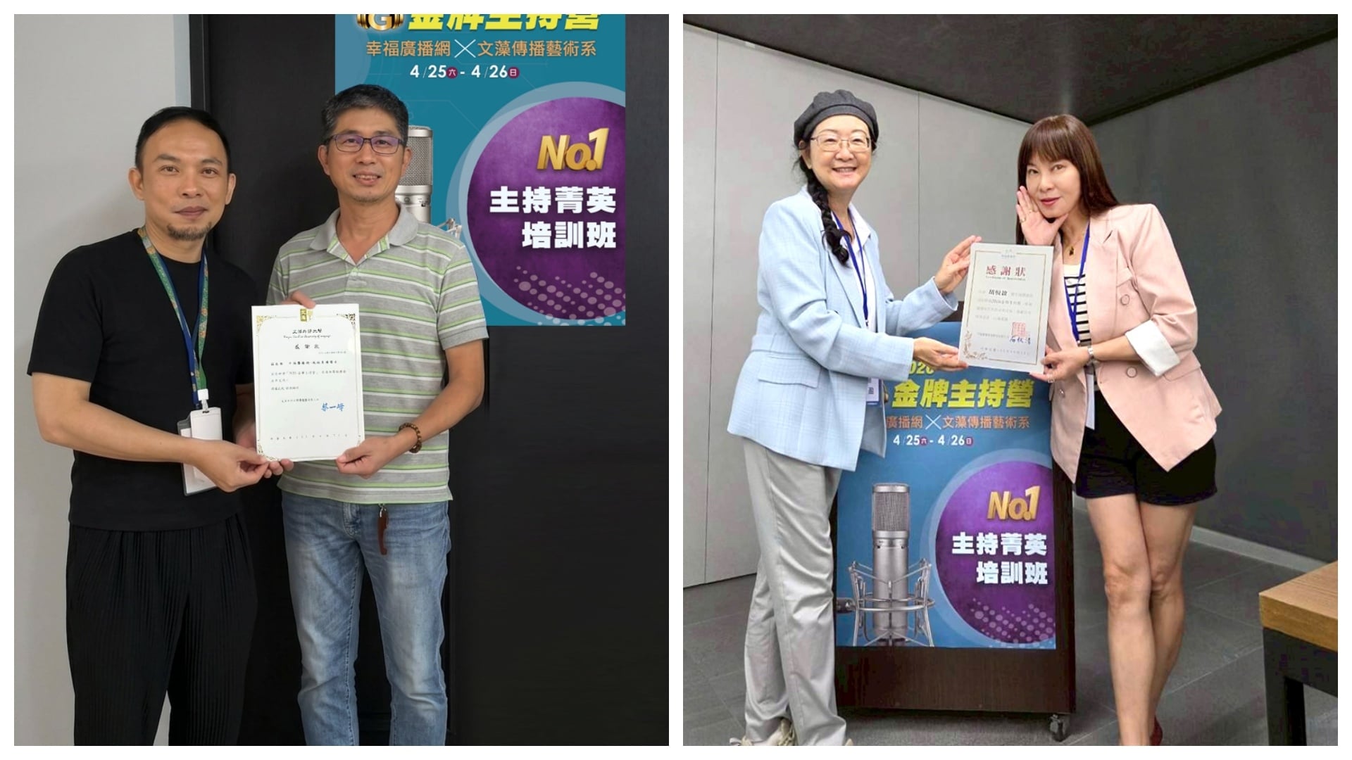 ↑圖說:金牌主持營_阿弘(左1)與文藻傳藝系講師陳重友(左二)、金牌主持營_素蘭(右1)與文藻傳藝系講師方盈(右2)(圖片來源:幸福廣播網提供)