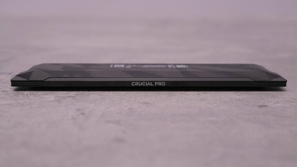 頂部一條為黑色亮面處理的塑膠,中間印有「CRUCIAL PRO」。塑膠部分算是整支記憶體上最容易留下指紋的地方。