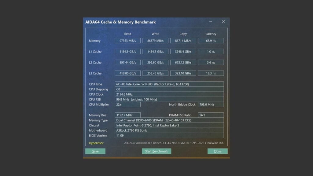 首先是 XMP(EXPO)的第一組設定值 DDR5–6400 CL32–40–40–103 CR2,讀取速度直接來到 97,363 MB/s,寫入速度 86,379 MB/s,延遲 65.9 ns,表現上非常優秀。