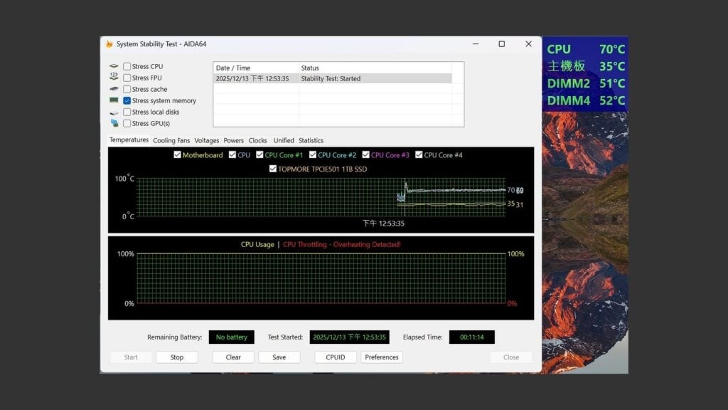 使用第一組 DDR5–6400 CL32–40–40–103 CR2 的設定,透過 AIDA64 燒機 10 分鐘,記憶體模組的溫度也僅 52 度而已,散熱表現相當不錯。