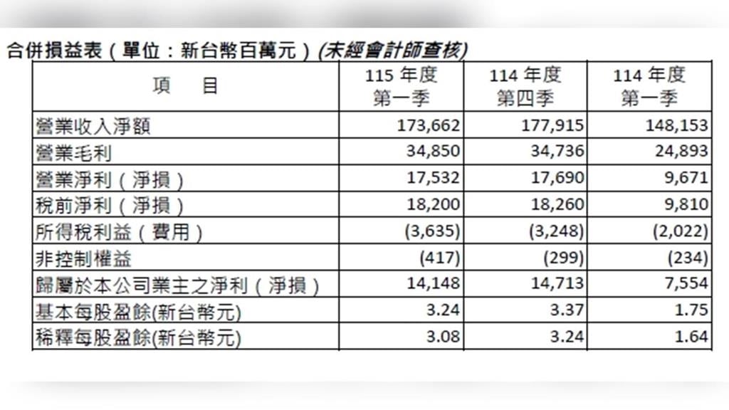 日月光投控第一季合併營收達1,736.62億元,季減約2.4%,但較去年同期成長17.2%;稅後淨利為141.48億元,每股盈餘3.24元,較去年同期明顯提升。