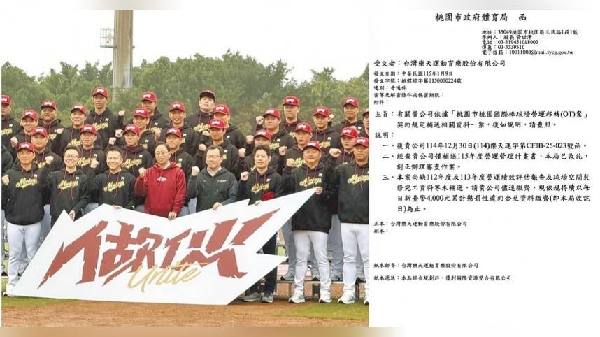 樂天桃猿主場樂天桃園國際棒球場設施安全問題持續延燒,繼去年遭球迷向時報周刊CTWANT投訴球團寧願斥資8千萬元打造頂級轉播副控中心,卻不願重視公共安全設施,放任頂棚鏽蝕、甚至出現鐵屑掉落。對此,日前桃園市政府已針對球場管理不善,在2026年1月連續開出兩張裁罰公文,金額分別約18萬元與30多萬元。