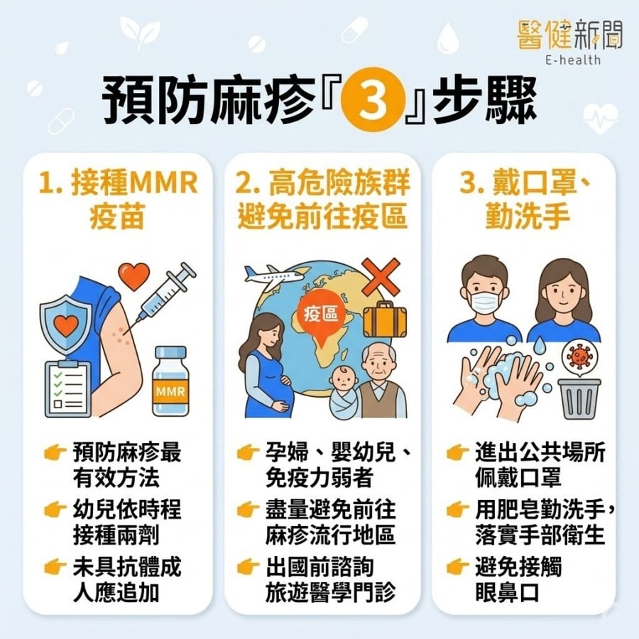 疾管署提醒,麻疹傳染力非常強,可經空氣傳播,接種疫苗為預防麻疹最有效的方法,提醒民眾應按時帶幼兒接種麻疹、腮腺炎、德國麻疹混合(MMR)疫苗,另因經接種疫苗所產生的免疫力可能會隨時間而降低,建議1966年(含)以後出生的成人,近期如計畫前往麻疹流行地區,可於出國前2至4週至旅遊醫學門診諮詢醫師自費接種MMR疫苗。孕婦及未滿1歲嬰幼兒為感染高危險群,應避免前往流行區;如須攜6個月以上未滿1歲的嬰兒前往,可於出發前帶幼兒至衛生所或旅遊醫學門診諮詢自費接種1劑MMR疫苗。出國期間並應注意個人衛生,勤洗手,避免觸摸口鼻,並適時佩戴口罩,以降低感染風險。