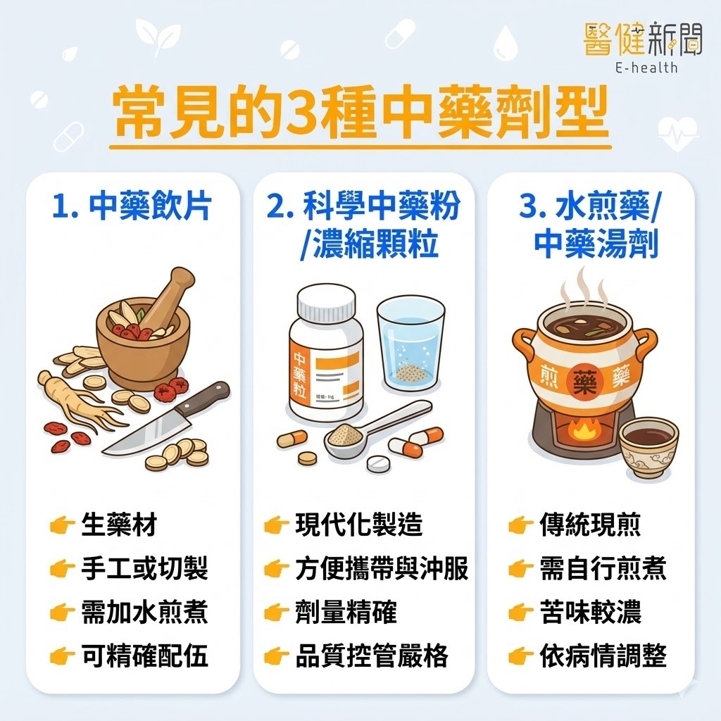 3.水煎藥/中藥湯劑:將中藥飲片加水熬煮後去渣的液體藥劑。