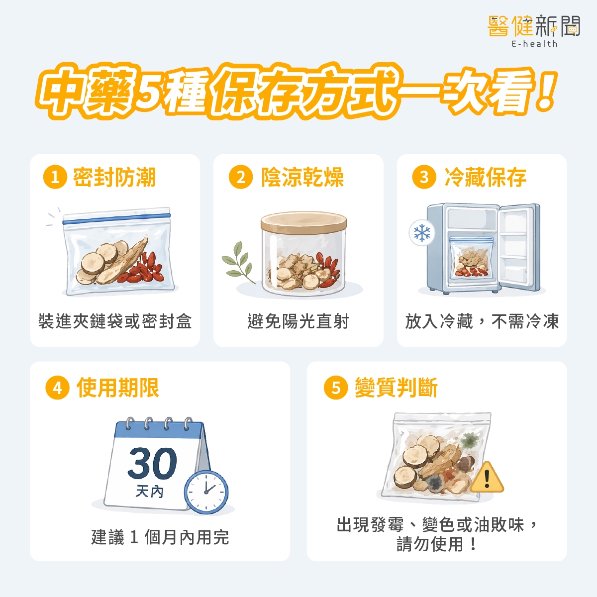 張煒中醫師表示,因為台灣氣候炎熱潮濕,中藥若保存環境不佳,不僅影響藥效,也容易受潮發霉、變質及蟲蛀等,不可不慎。保存的基本原則就是防潮、防熱、避光,以下也為大家一一整理不同類型的中藥保存方式: